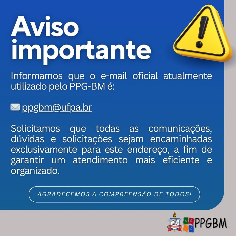 Informamos que o e-mail oficial atualmente utilizado pelo PPGBM é: