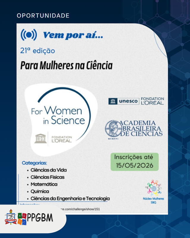 Estão abertas as inscrições para a 21ª edição do programa Para Mulheres na Ciência, promovido pelo Grupo L'Oréal no Brasil em parceria com a Academia Brasileira de Ciências (ABC) e a UNESCO no Brasil. A cada ano, 8 pesquisadoras das áreas de Ciências da Vida, Ciências Físicas, Ciências Químicas e Matemática são reconhecidas com uma bolsa de R$ 50 mil para impulsionar seus projetos.